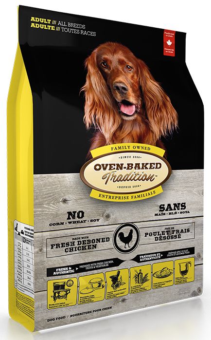 Oven-Baked Tradition's adult dog food is slowly oven-baked at low temperature to bring out the ingredients' flavors while preserving the integrity of essential nutrients and proteins. It's made in small batches to ensure freshness and quality. Fresh chicken is the first ingredient along with fruits & vegetables. It contains whole grains milled in-house and is made without wheat, corn or soy and has no artificial flavors or preservatives.